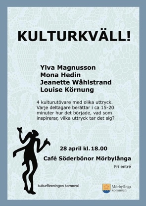 4 Kulturutövare med olika uttryck berättar i ca 15-20 minuter. " Hur det började, vad som inspirerar, vilka uttryck det tar sig!